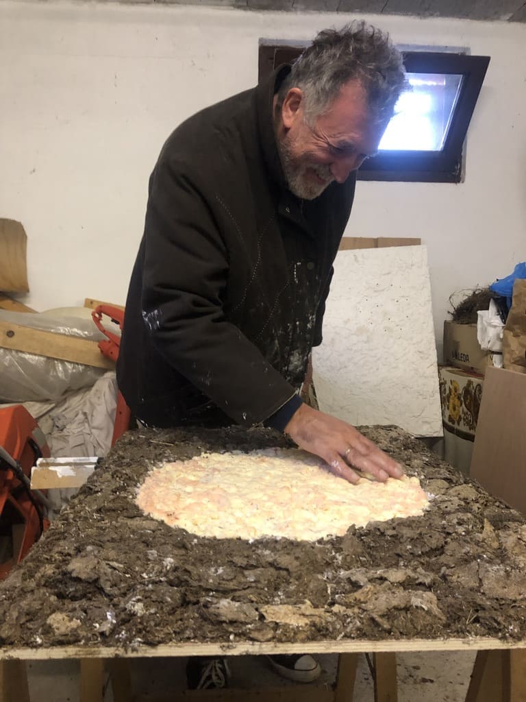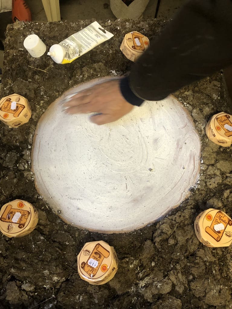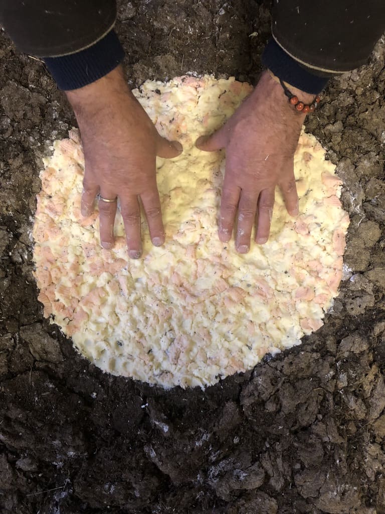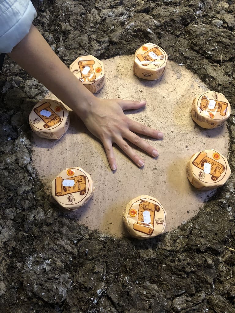 Pour mes monochromes, j’utilise trois « matériaux » naturels : de la bouse de vache, de l’herbe et du munster. Aussi, je vais non seulement récolter des bouses et de l’herbe dans les Vosges, mais je me fournis aussi en munster à Colmar.