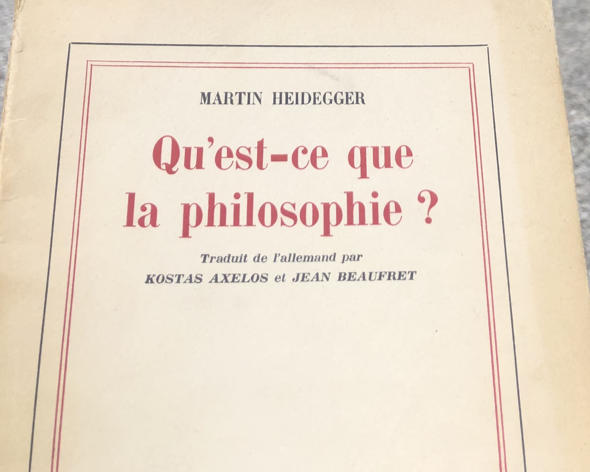 La conférence inaugurale donnée par Heidegger à Cerisy a pour titre : Qu’est-ce que la philosophie ? – Beaufret et le philosophe d’origine grecque Kostas Axelos ont, par la suite, traduit et publié ce texte chez Gallimard.