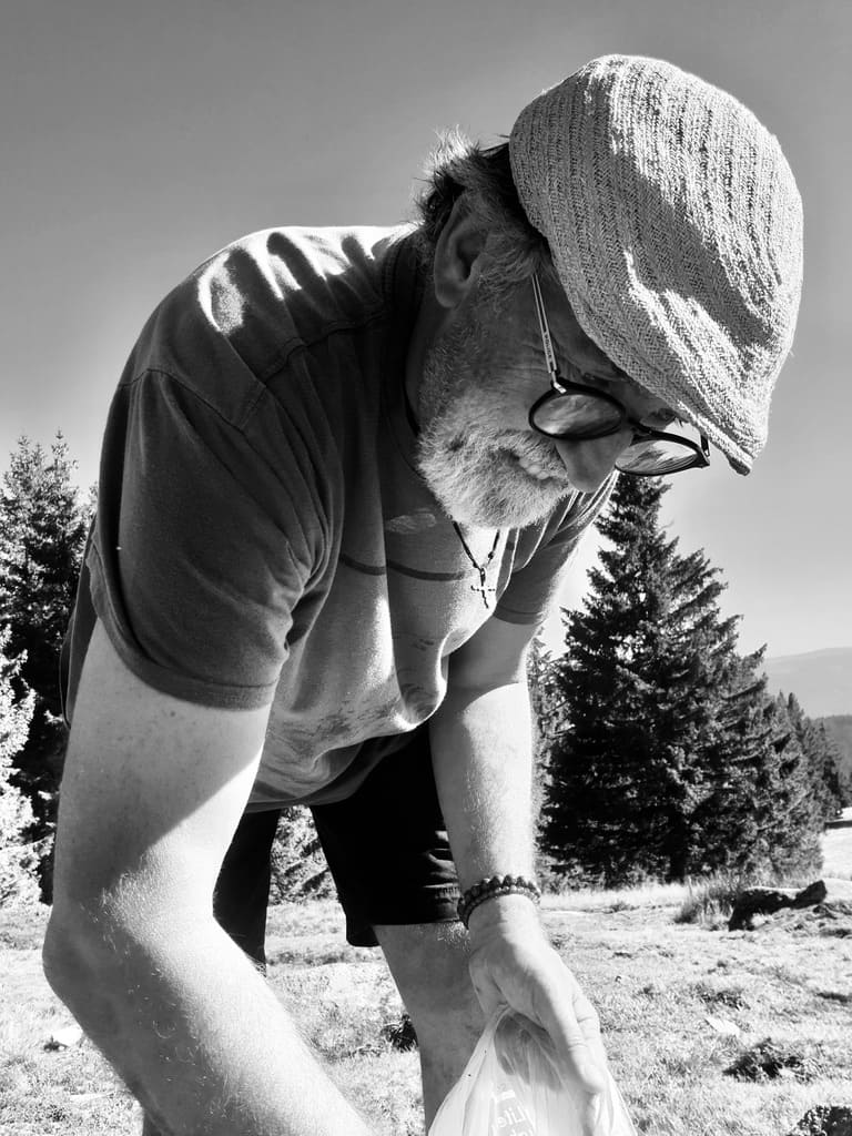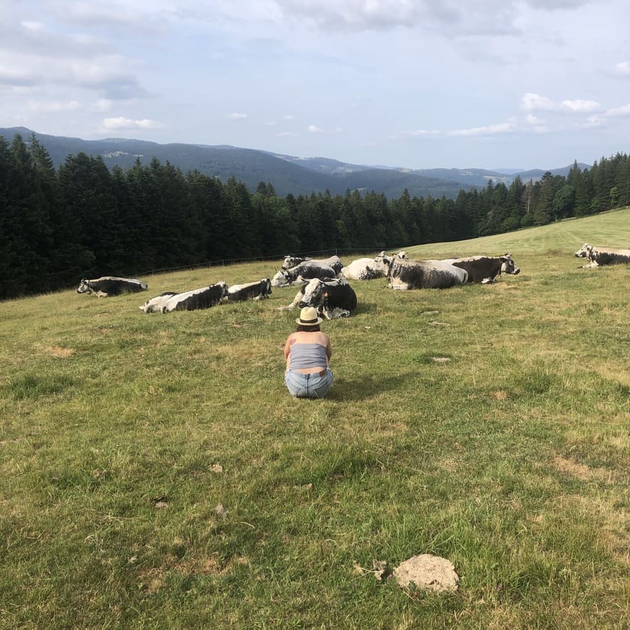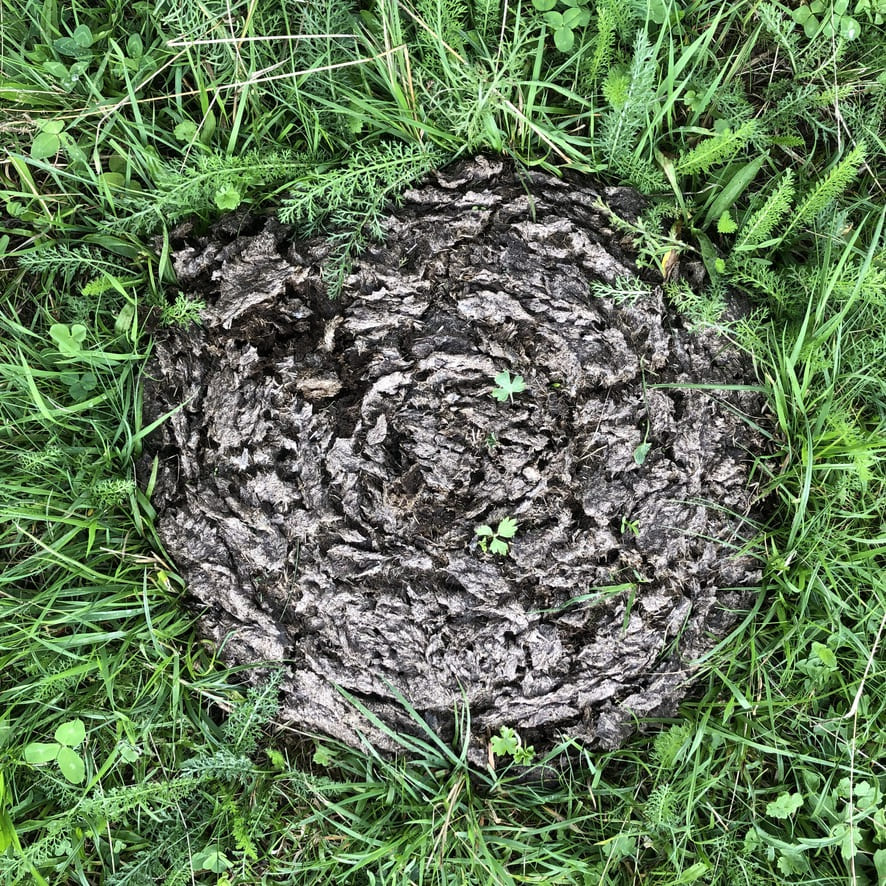Pour réaliser mes monochromes, j’utilise – en plus du contreplaqué, de la peinture et de la colle – trois matières premières naturelles : de la bouse de vache, de l’herbe et du munster. Aussi c’est dans les Vosges, accompagné de Caroline, que je récolte la bouse nécessaire. Plus exactement, au Tanet et au Gaschney ; ainsi qu’auprès des vaches de la Ferme Auberge des Buissonnets (au pied du massif du Rossberg). Si autrefois, les peintres s’en allaient par les chemins – avec leurs couleurs, leur toile et leur chevalet – pour peindre des paysages ; je fais perdurer cette tradition en suivant leurs pas, mais seulement muni de sacs en plastique, pour ramener cette bouse amenée à être peinte.